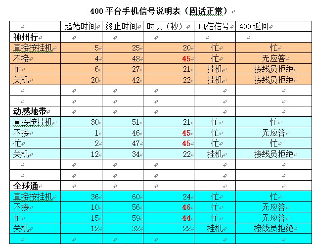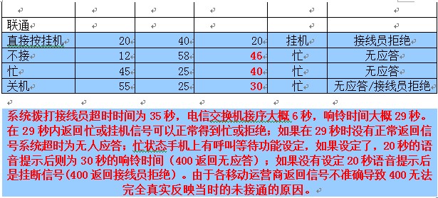 如果座席是手机,手机在 “不在服务区“”已关机“”直接拒绝“情况下,移动联通电信都不给信号,而是给提示语音,大约25秒后才给忙信号,系统才能识别,导致主叫这边还是响铃音。(联通20秒、 神州行20秒、 全球通24秒、 动感地带21秒,详细请见上表)
